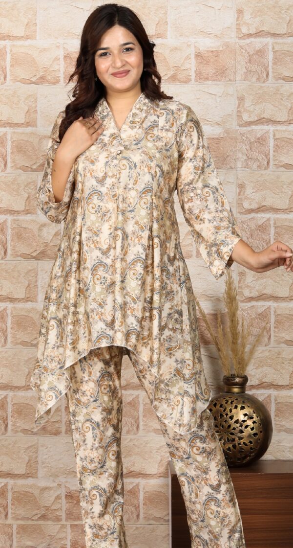 Discover the epitome of elegance with our “Elegance Refined” Co-ord Set. Crafted from luxurious Modal Chanderi Silk fabric, this ensemble offers a delightful blend of luxury and comfort. The Digital Foil Printed pattern adds a touch of glamour, making it perfect for special occasions. Designed with a sophisticated Chinese Neckline and stylish Chinese Cuffs on the sleeves, this set exudes a graceful and modern look.