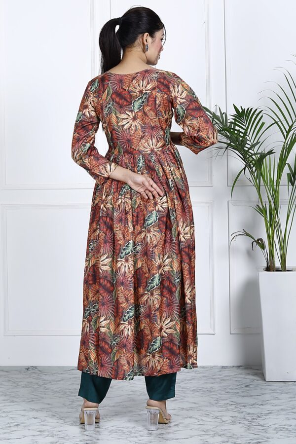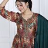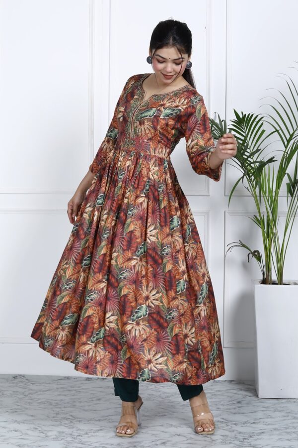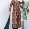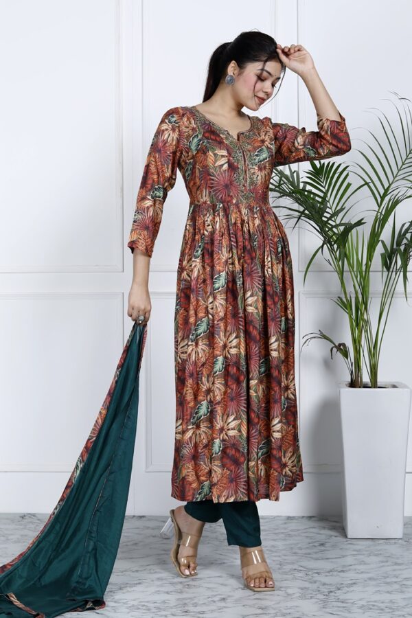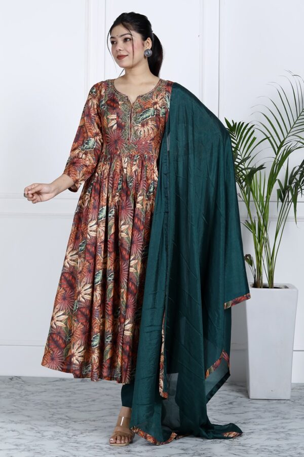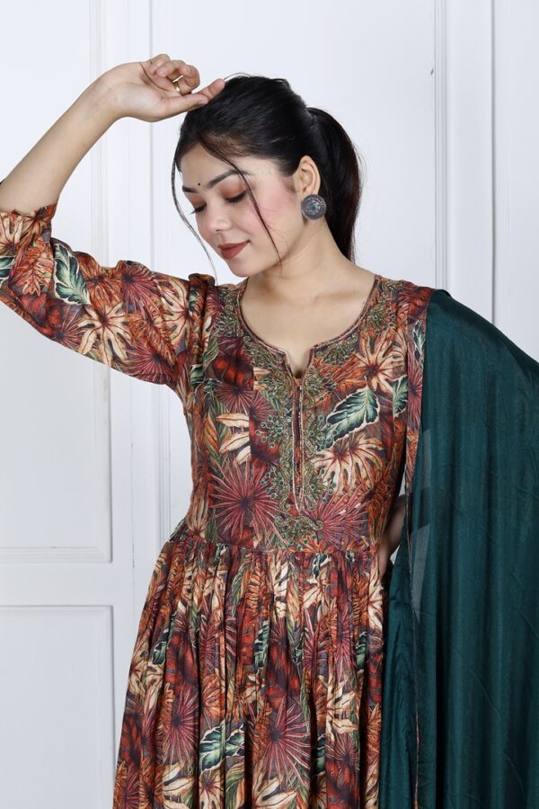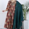 Exclusive Digitally printed Pure Muslin 3 Pc Anarkali flared Suit set features a full flare Kurta with a zardoshi handwork on round neck & yokeline in three-quarter sleeves. Fine art Zardoshi Handwork on neck makes it exclusive party look for any special occasion. Complemented with broad matching straight Pant in a partially elasticated waistband style made with soft shantoon blended silk fabric. A dyed dupatta in Chiffon with printed muslin border on four sides makes it a complete hi-class ethnic wear suit piece for you. Heavy handwork embroidery on neck makes this comfortable style as perfect outfit for occasional wear & wedding parties.