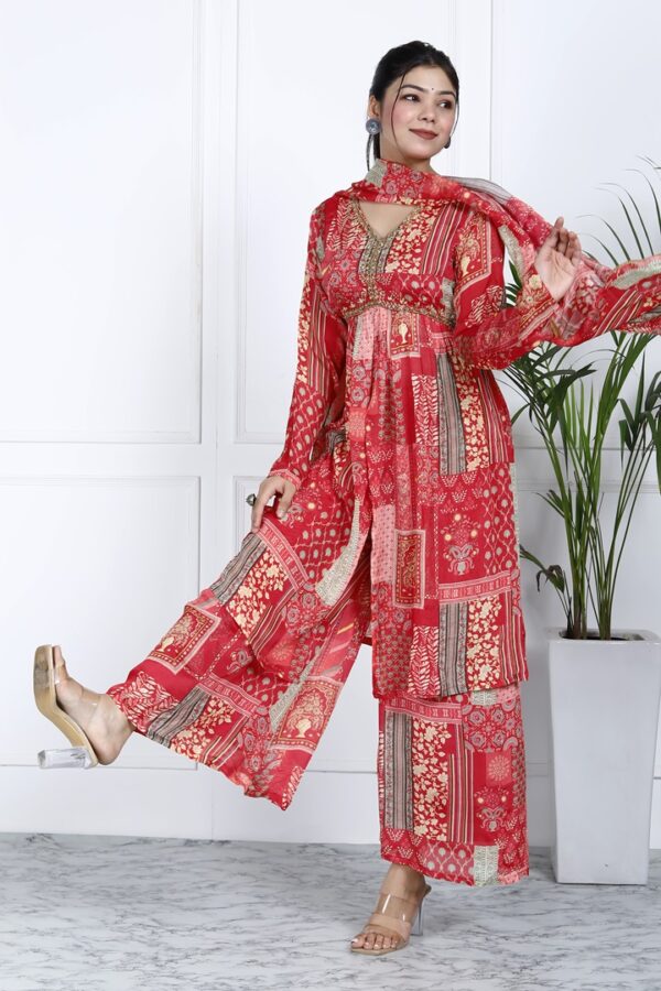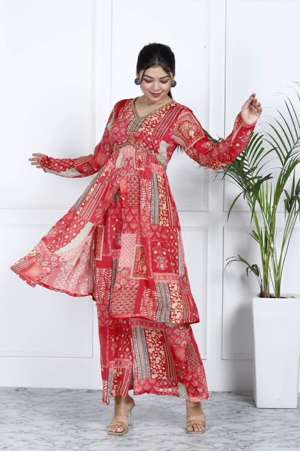 Fine art handwork on front body makes it exclusive party look for any special occasion. Complemented with broad matching print Sharara in fully elasticated waistband of Pure Chinnon fabric. Pure Chinnon Dupatta in short width but full length sequins handwork lace on four sides makes it a complete hi-class indowestern wear. Designer Cut as front slit in Kurta with short length makes this trendy style as perfect outfit for occasional wear for celebrations & wedding parties.