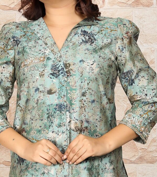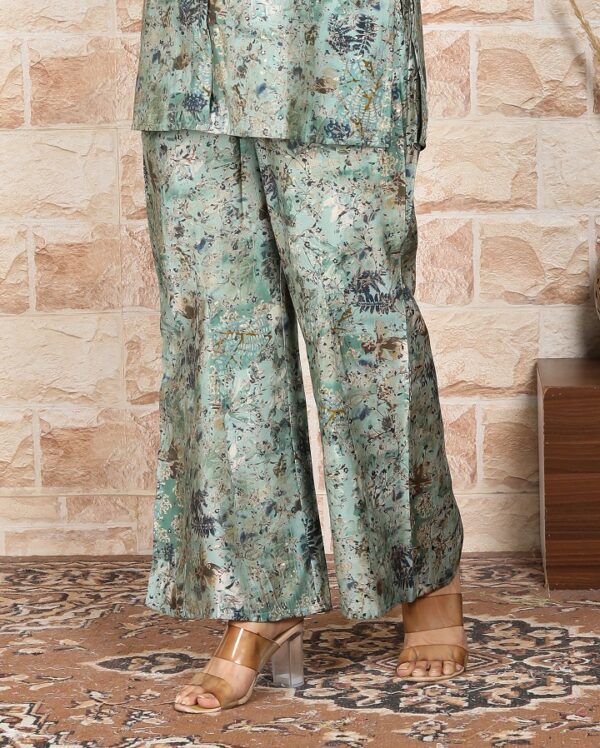 Immerse yourself in the refreshing charm of our “Minty Delight” Co-ord Set. Crafted from luxurious Modal Chanderi Silk fabric, this ensemble offers a delightful touch of luxury and comfort. The Digital Foil Printed pattern adds a touch of allure, perfect for special occasions. Designed with a chic Coat Pant neckline and stylish 3/4th sleeves, this set creates an elegant and contemporary look.