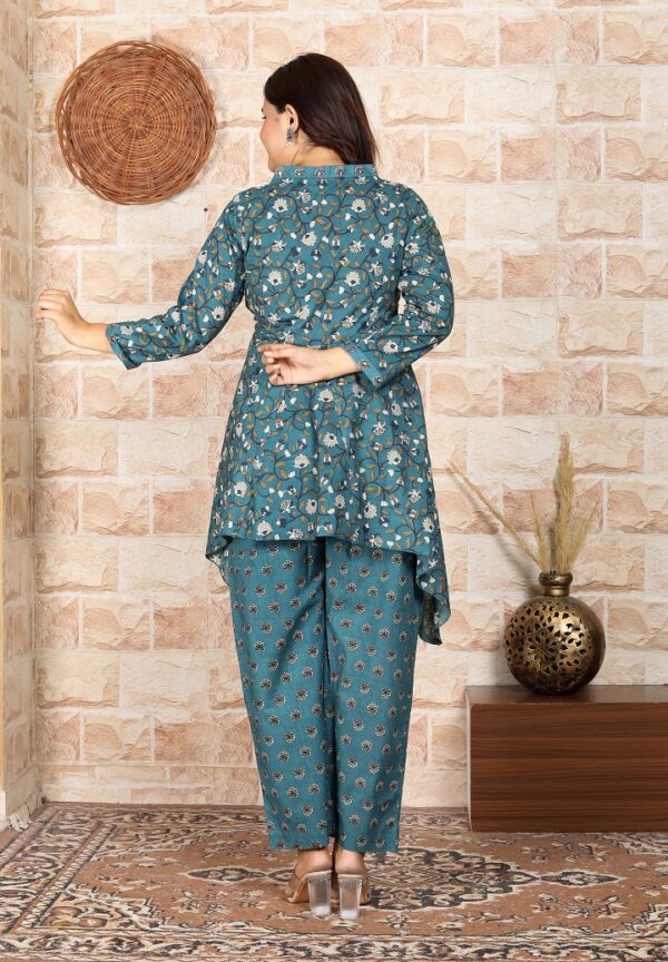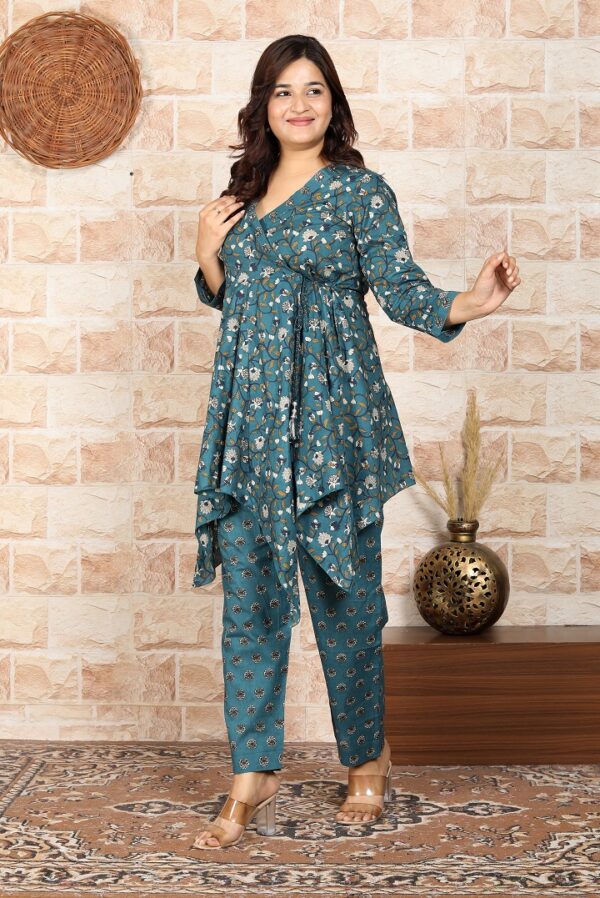 Indulge in the allure of our “Teal Temptation” Co-ord Set. Crafted from Silky Cotton Fabric, this ensemble offers a luxurious and comfortable feel. The Multicolor Discharge Print pattern adds a touch of vibrancy, perfect for any occasion. Designed with a stylish Angrakha neckline and 3/4th sleeves, this set creates a graceful and contemporary look. Step into the world of “Teal Temptation” and elevate your style with its captivating design and luxurious fabric. Whether it’s a festive celebration or a special occasion, this beautifully crafted ensemble is sure to make you stand out with elegance and charm.