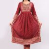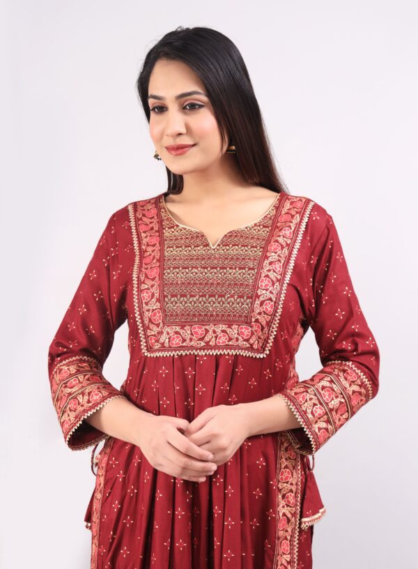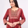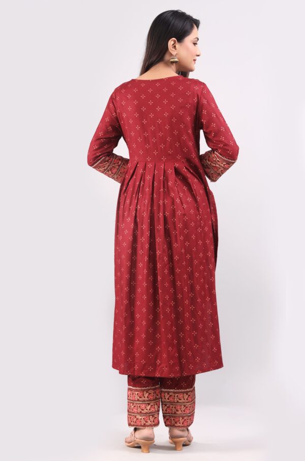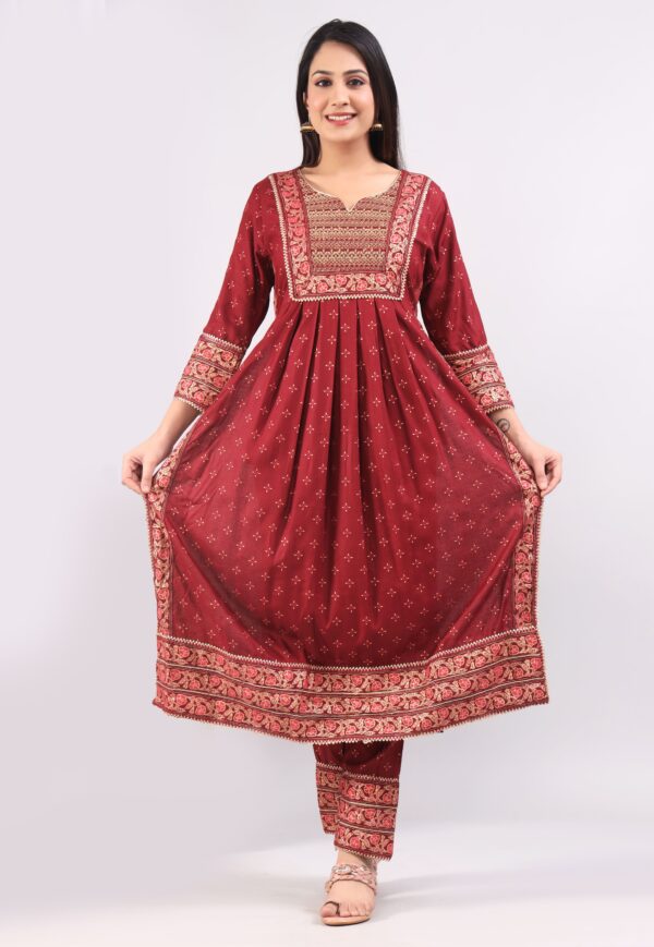 Modern Nyra Kurta Set is made with Gold Foil Block Print Rayon fabric in Maroon color. This Nyra style is a Modern cut Kurta Set with hand block printing on borders to make it look expensive and hi fashion product. Crafted from Pure & Soft Rayon fabric, its unique design and beautiful gold color print will fetch a lot of attention when you wear it with golden jewelry. It is flashing with designer laces and embroidery yoke giving royal ethnic yet modern look. Wear it and put your step in latest trend of fashion.