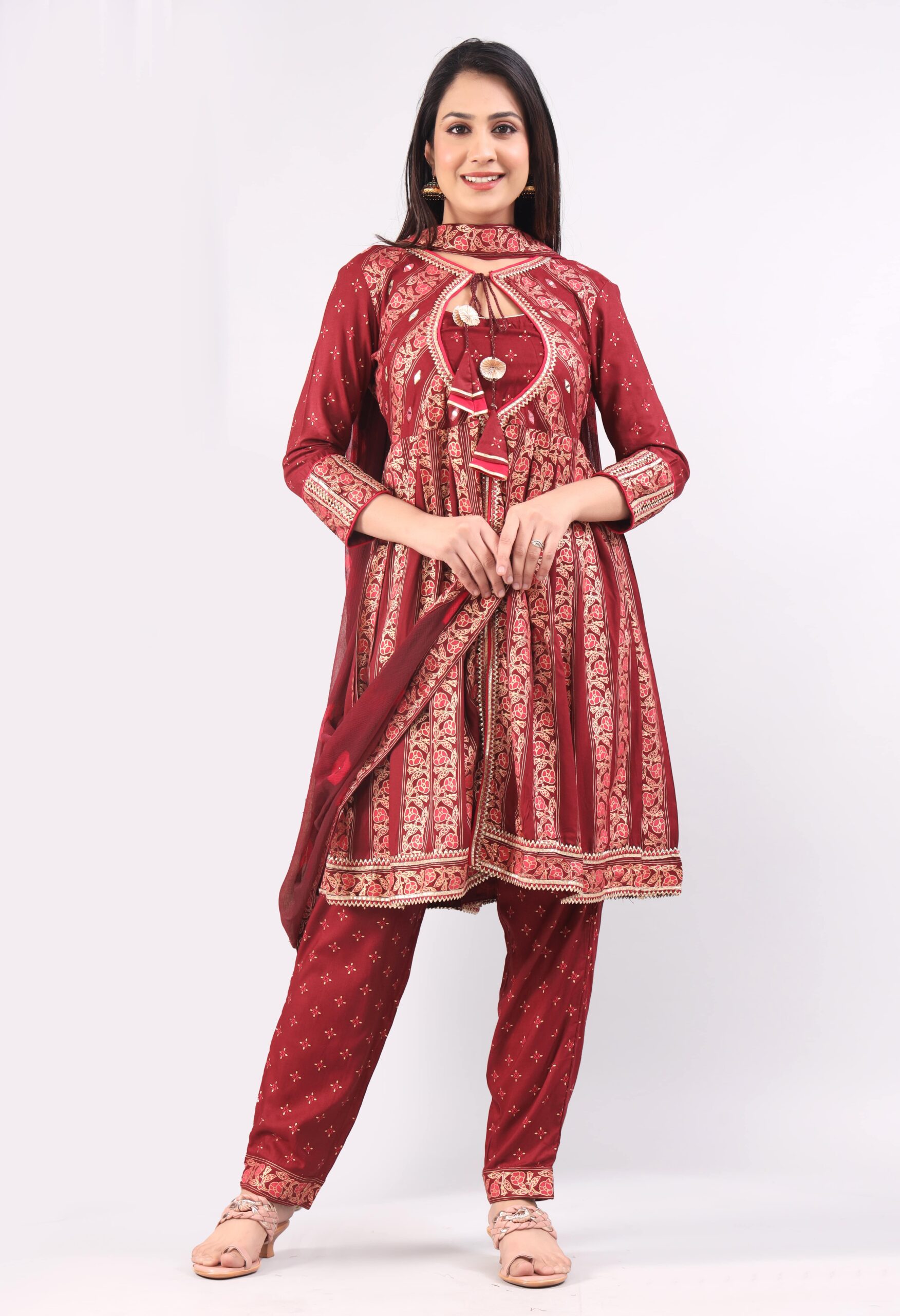 This Kurta Set is made with Gold Foil Block Print Rayon fabric in Maroon color. This extra ordinary Modern Cut Short Kurta Set will make you an example of fashion statement. Crafted from Pure & Soft Rayon fabric, its unique design and beautiful gold color print will fetch a lot of attention with you wear it with golden jewelry. Its designer cut, royally ethnic yet modern look will make you look show stopper in functions and parties.